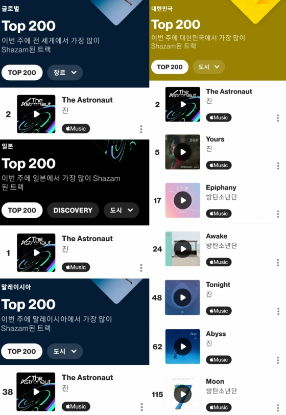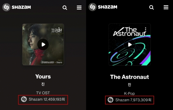 진은 지난 해 5월 20일 tvN 드라마 '지리산'의 메인 OST곡인 '유어스(Yours)'로 글로벌 주간 차트에 첫 등장했으며, 이후 꾸준히 이름을 올리며 '글로벌 주간 차트 톱 10'에 33회 차트인했다. '샤잠 글로벌 주간 톱10 아티스트'는 전 세계 최정상 아티스트들과 치열하게 경쟁하는만큼 한국에서는 진이 속해 있는 방탄소년단, 그리고 진만이 1위를 차지하며 그 명성을 입증받았다.