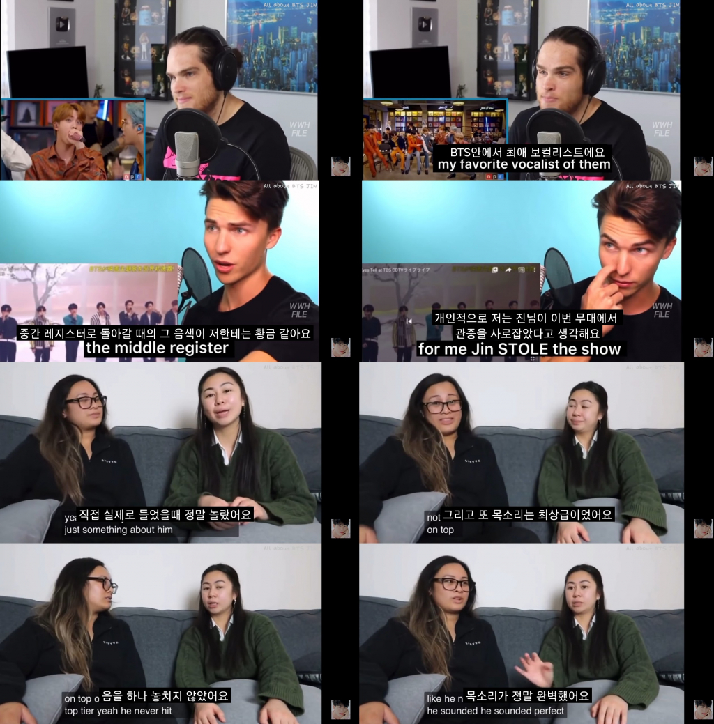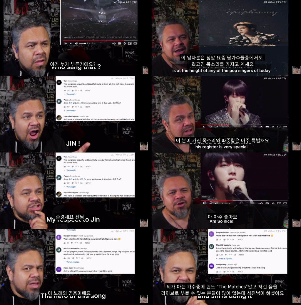 수많은 가수를 분석해온 보컬 코치가 진의 보컬에 최고라는 찬사를 아끼지 않은 것. 전문가들의 진의 보컬을 향한 진심 어린 감동과 극찬은 이뿐만이 아니다. 진의 솔로곡뿐 아니라 방탄소년단의 단체곡에서도 전문가들은 이 부분을 부른 사람이 누구냐고 물으며 진의 완벽한 실력에 감탄했다.