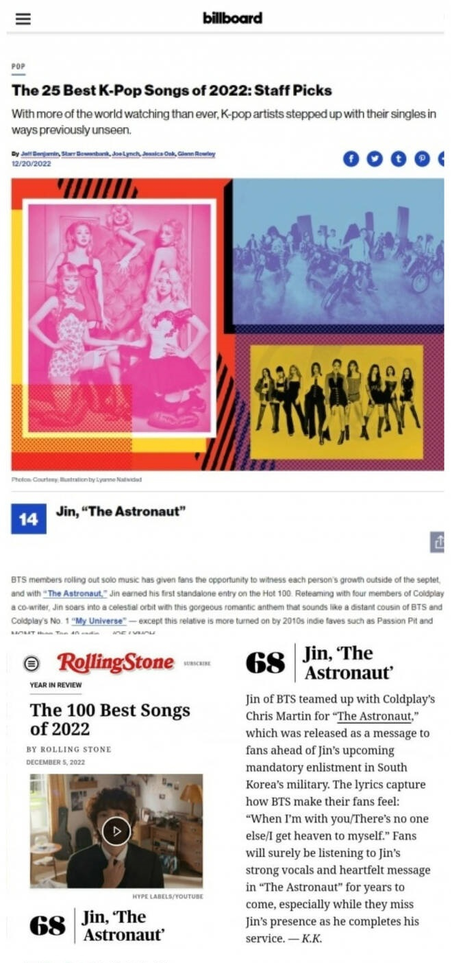 또 미국 최고의 음악잡지 롤링스톤이 선정한 'The 100 Best Songs of 2022'에서 '디 애스트로넛'이 68위를 차지, 진은 아시아 솔로이스트 중 최고 순위를 기록했다.
