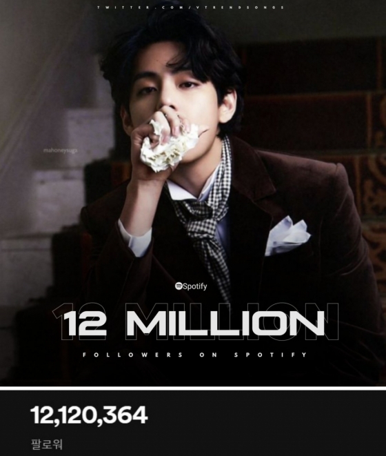 스포티파이에 따르면 뷔의 스포티파이 페이지는 2월 21일 팔로워 1200만 명을 돌파했다. 2월 23일 기준으로 1212만 364만 명을 기록하고 있다.