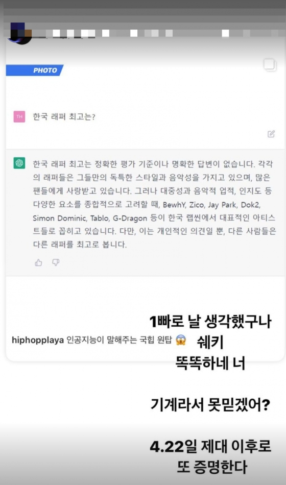 글에는 '한국 최고의 래퍼는?'이라는 질문에 대한 내용이 담겨 있었다. 이에 AI가 답변한 걸로 나온 글에는 비와이를 비롯해 지코 박재범 도끼 사이먼도미닉 타블로 지드래곤 등이 언급돼 있었따.