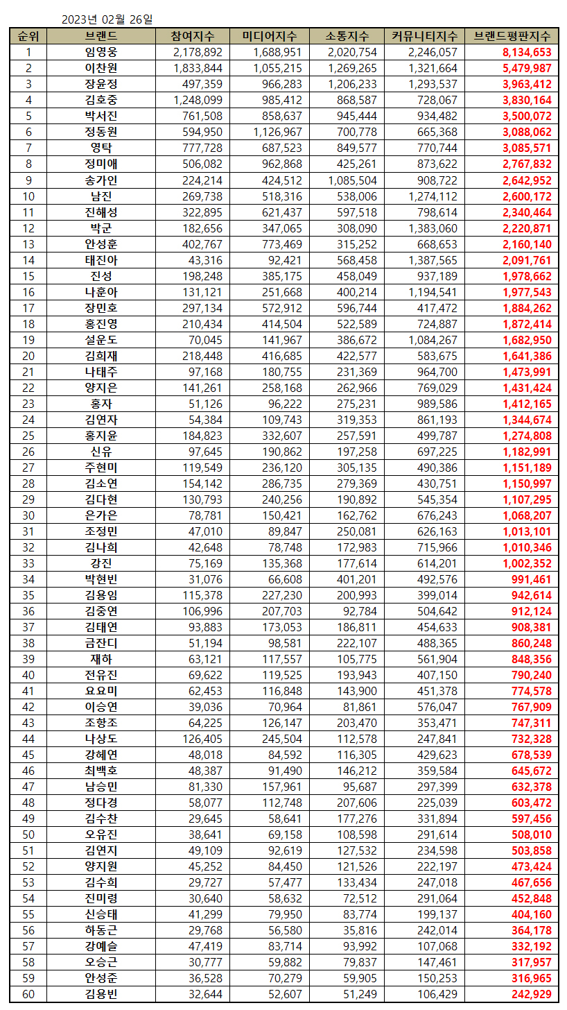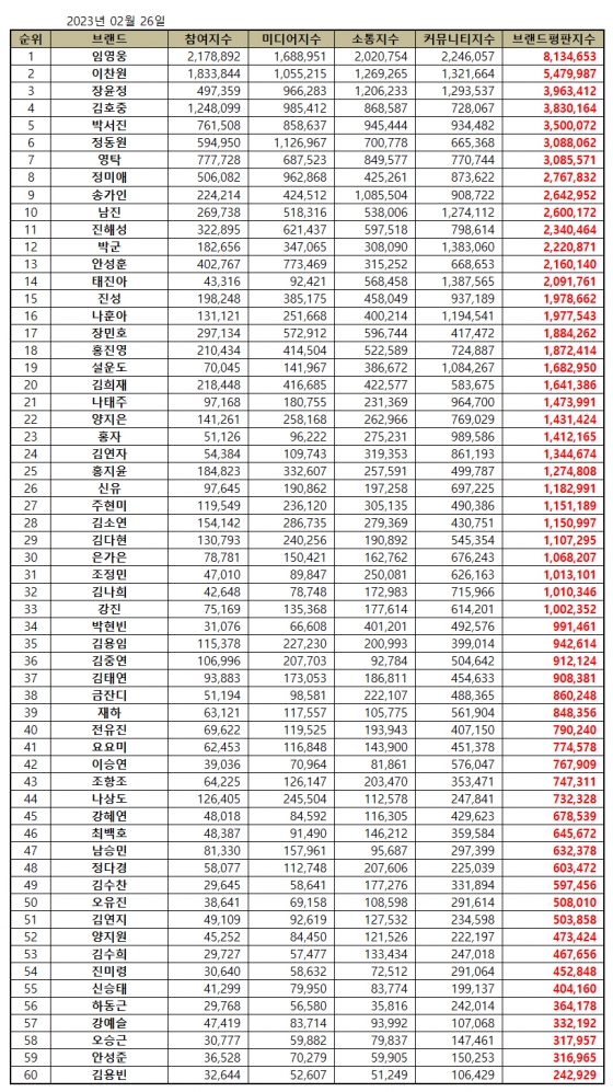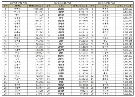 2023년 2월 트로트 가수 브랜드평판 30위 순위는 임영웅, 이찬원, 장윤정, 김호중, 박서진, 정동원, 영탁, 정미애, 송가인, 남진, 진해성, 박군, 안성훈, 태진아, 진성, 나훈아, 장민호, 홍진영, 설운도, 김희재, 나태주, 양지은, 홍자, 김연자, 홍지윤, 신유, 주현미, 김소연, 김다현, 은가은 순으로 분석됐다.