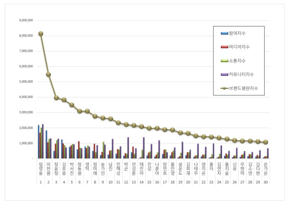 임영웅 브랜드는 참여지수 2,178,892 미디어지수 1,688,951 소통지수 2,020,754 커뮤니티지수 2,246,057이 되면서 브랜드평판지수 8,134,653으로 분석됐다.