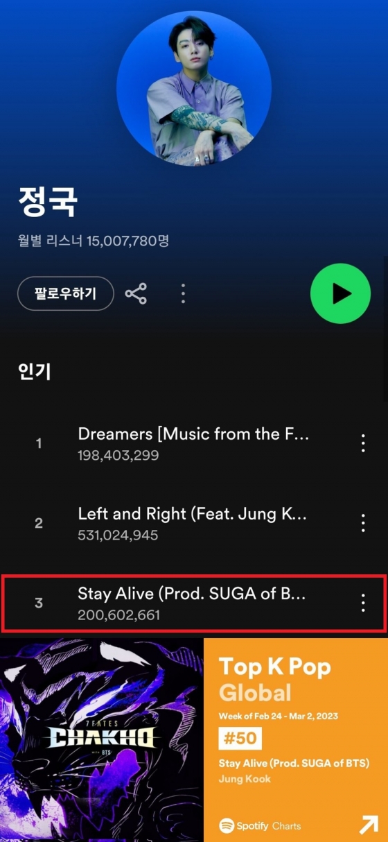 지난해 2월 11일 발매된 정국의 솔로곡이자 웹툰 '세븐페이츠: 착호(7FATES: CHAKHO)' OST 'Stay Alive'는 3월 9일 기준 세계 최대 음원 스트리밍 플랫폼 스포티파이(Spotify)에서 2억 스트리밍을 돌파했다.