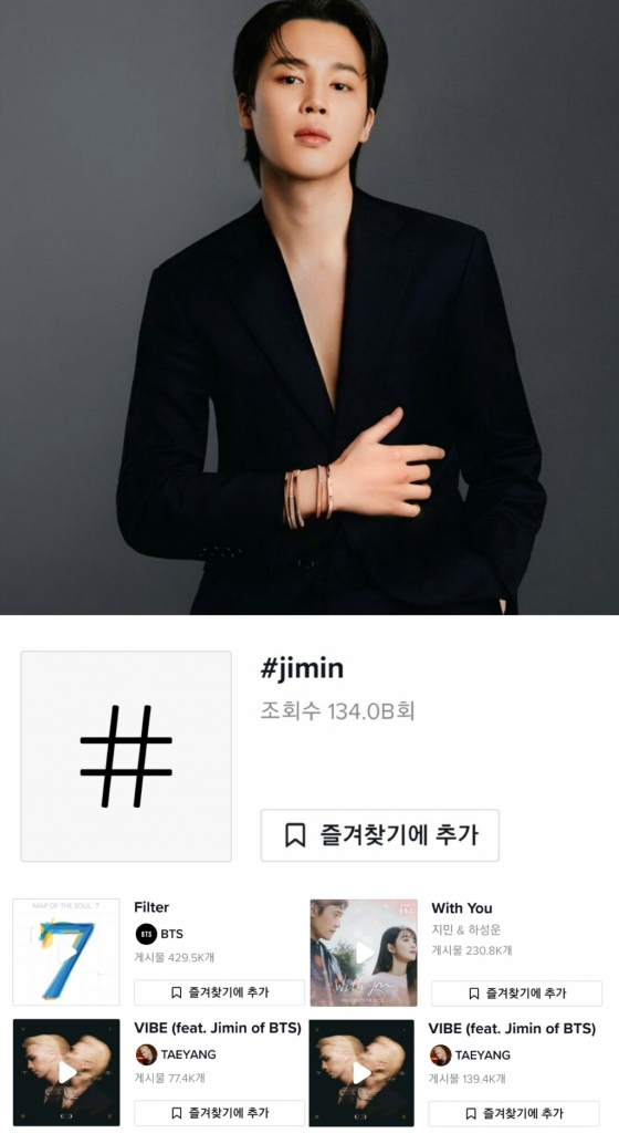 지민의 해시태그 '#jimin'이 글로벌 동영상 플랫폼 틱톡(TikTok)에서 3월 7일 기준 단일 언급량 1340억 뷰를 돌파했다.