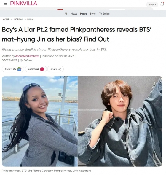 방탄소년단의 오랜 팬인 영국 가수 핑크팬서리스(PinkPantheress)는 자신의 최애로 진을 꼽아 주목을 받았다.