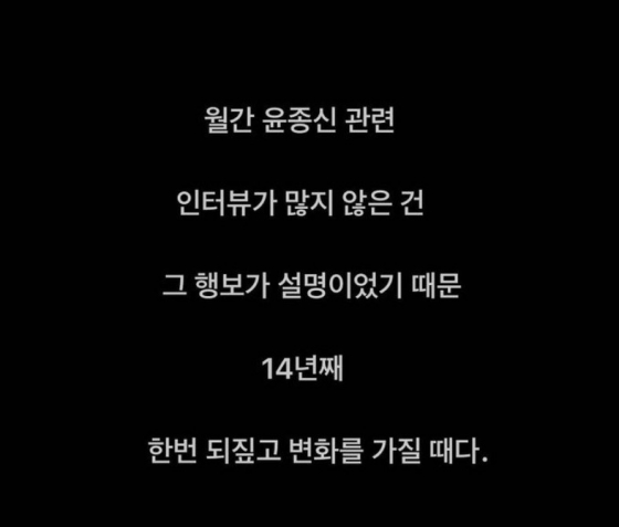 윤종신은 16일 자신의 인스타그램에 "월간 윤종신 관련 인터뷰가 많지 않은 건 그 행보가 설명이었기 때문. 14년 째 한번 되짚고 변화를 가질 때"라고 말했다.