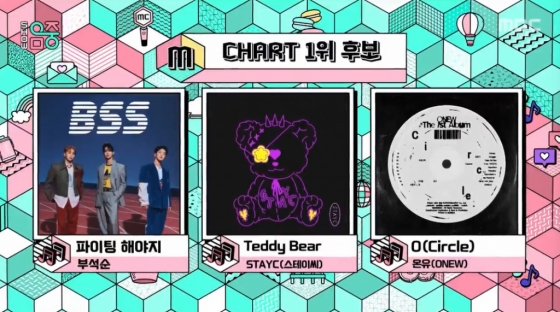 이날 부석순은 '파이팅 해야지', 스테이씨는 'Teddy Bear', 온유는 'O(Circle)'로 '음중' 1위 후보에 이름을 올렸다.