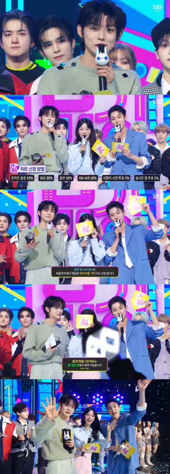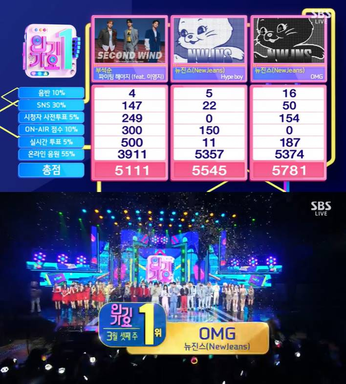 뉴진스는 공식 활동을 종료해 이날 방송에 출연하지 않았음에도 1위를 차지해 인기를 입증했다. 뉴진스는 지난 1월 발표한 싱글 1집 앨범 'OMG'로 세 달째 오랜 인기를 자랑했다.
