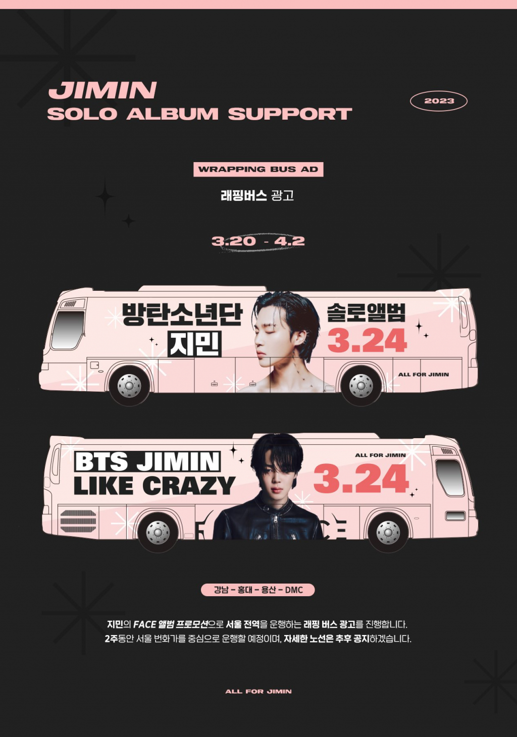 그뿐만 아니라 3월 20일부터 4월 2일까지 서울 전역을 운행하는 래핑 버스 광고를 진행, 2주동안 강남/홍대/용산/DMC 등 서울 번화가를 중심으로 운행할 예정이며 자세한 노선은 추후 '올포지민' 공식 SNS에서 확인할 수 있다.