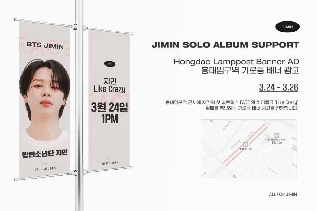 이어 24일부터 26일까지 홍대입구역 근처에서 'FACE'의 타이틀곡 'Like Crazy'(라이크 크레이지) 발매를 홍보하는 가로등 배너 광고를 예고했다.