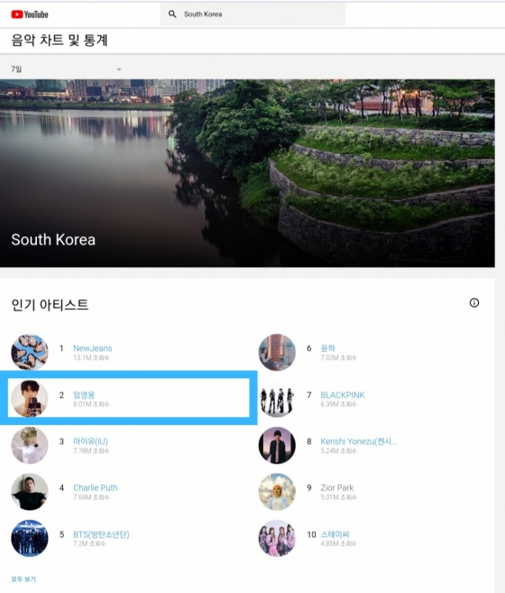 임영웅은 3월 22일 기준 유튜브 한국 최근 7일 조회수 2위를 차지했다. 임영웅은 7일간 조회수 801만 뷰를 기록했다.