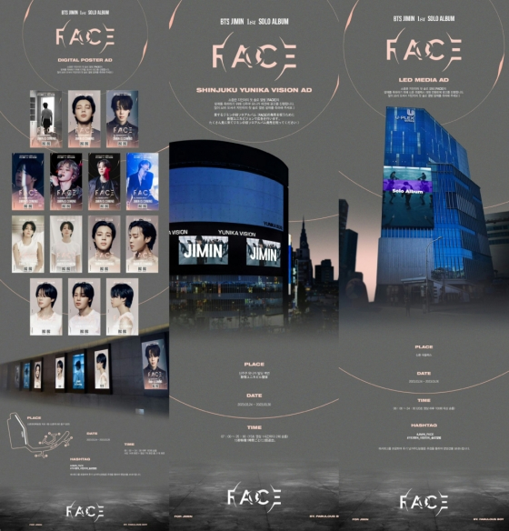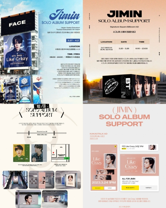 올포지민 코리아(ALLFORJIMIN_KOR)는 일본 오사카의 최대 번화가 도톤보리에 위치한 츠타야 에비스바시 히트 비전에 지민의 솔로 앨범 'FACE'(페이스) 발매 기념 프로모션을 진행한다.