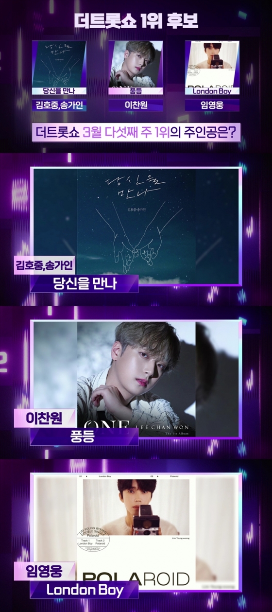 3월 마지막주 1위 후보곡은 뮤직비디오 조회 수 1천 2백만 뷰를 넘으며 폭발적인 인기를 끌고 있는 임영웅의 'London Boy'와 최강 보컬 조합으로 사랑 받는 김호중&송가인의 '당신을 만나', 초동 판매량 57만 장을 기록하며 전국 투어 콘서트를 시작한 이찬원의 '풍등'이 선정됐다. 트로트계 최강자들이 경합을 벌이는 가운데 '더 트롯쇼'에서 2주 연속 1위를 차치한 이찬원이 정상을 차지 할 수 있을지 궁금증을 더한다.