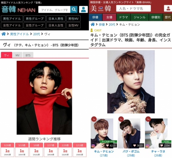 일본 인기 아이돌 랭킹 사이트 '네한(音韓)'이 3월 20일부터 3월 26일까지 진행한 'KPOP 남자 아이돌 랭킹' 투표에서 뷔가 1만 9043표를 획득, 104주 연속 1위의 대기록을 달성하며 또다시 자체 신기록을 경신했다.