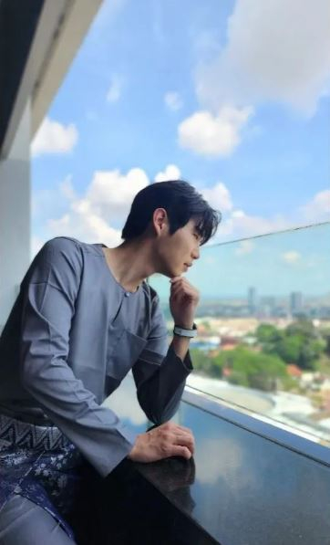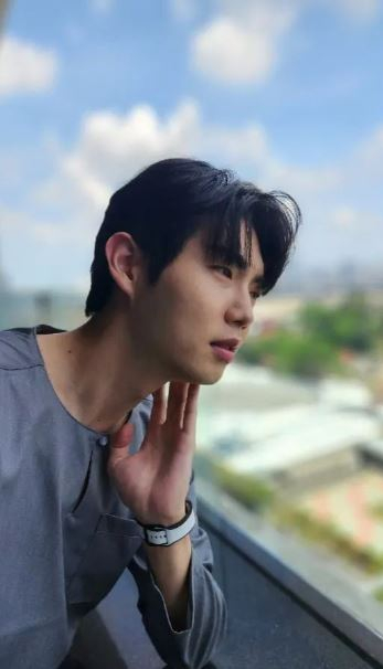 사진에서 손태진은 어딘가에 턱을 괴고 바깥을 응시하고 있다.