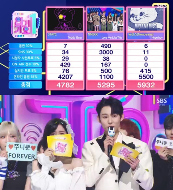 이날 1위는 뉴진스에게 돌아갔다. 뉴진스는 온라인 음원에서 강세를 보이며 총점 5932점을 획득했다.