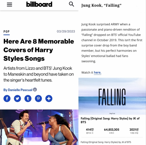 정국의 'Falling' 커버는 최근 미국 음악 매체 빌보드(billboard)가 선정한 '기억에 남는 해리 스타일스 커버곡 8선'에 꼽혔다.