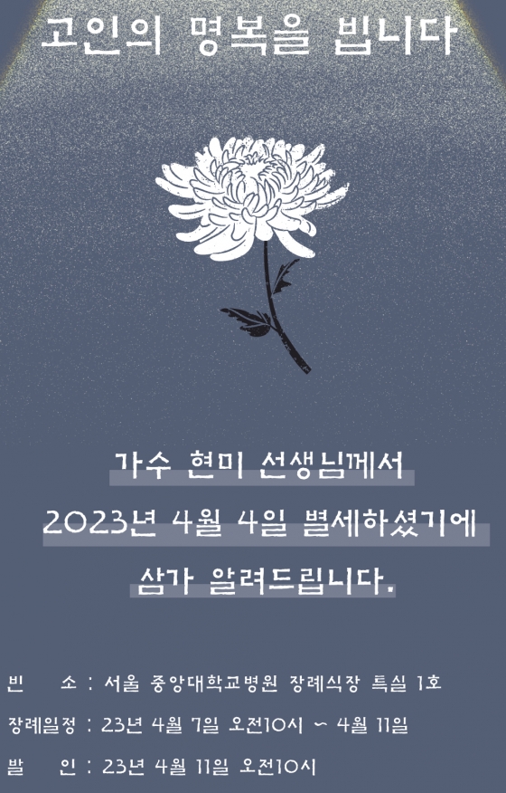 [윤성열 스타뉴스 기자] 지난 4일 별세한 '영원한 디바' 고(故) 현미(본명 김명선)의 빈소가 마련된다.