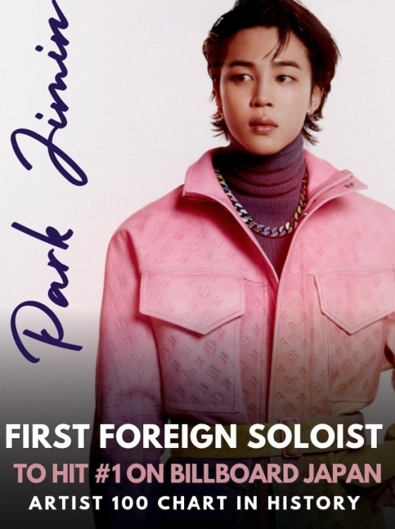 지민이 3월 29일 자 빌보드 재팬 '아티스트 100' 차트 1위에 올랐다. 자국 가수가 아닌 해외 솔로 가수 최초이자 유일한 대기록이다.