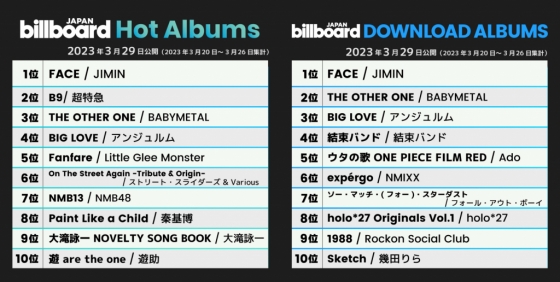 지난달 24일 발매한 지민의 솔로 앨범 '페이스'(FACE)는 3월 넷째 주(3월 20일~3월 26일) 빌보드 재팬 '종합 앨범'(Hot Albums) 차트에서 단 3일 만의 집계 반영으로 종합 선두에 올랐다.