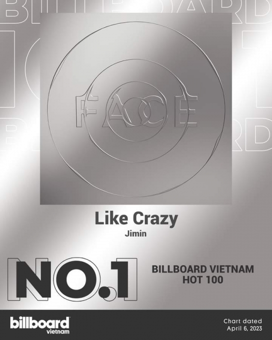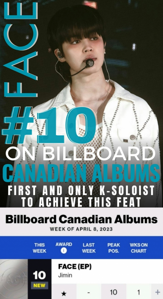 지민의 첫 솔로 앨범 '페이스'(FACE)는 4월 8일 자 빌보드 캐나다 앨범 차트 10위에 올랐다. 이는 빌보드 캐나다 톱10 차트에 진입한 최초이자 유일한 K팝 솔로 아티스트의 기록이다.