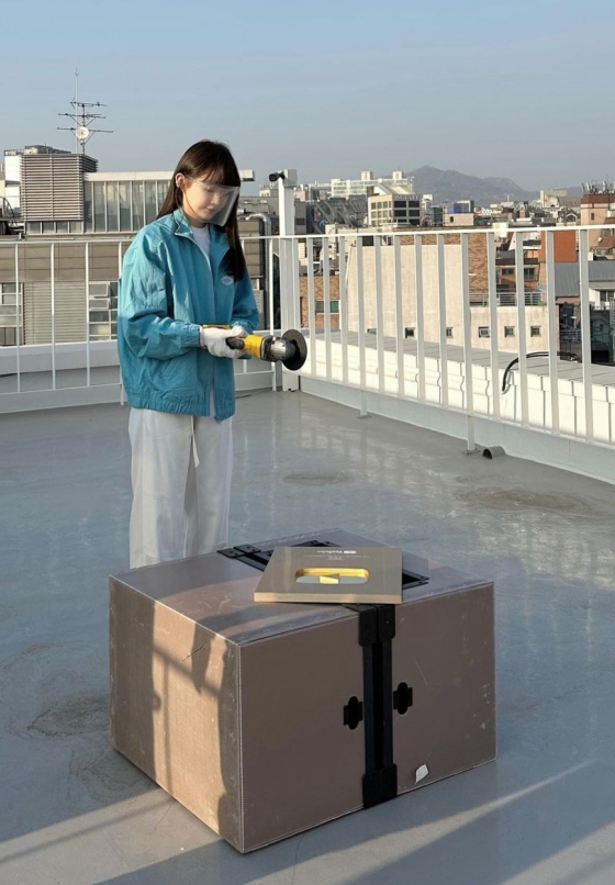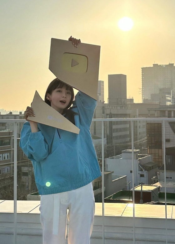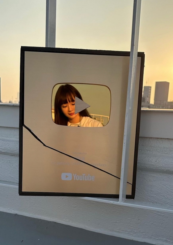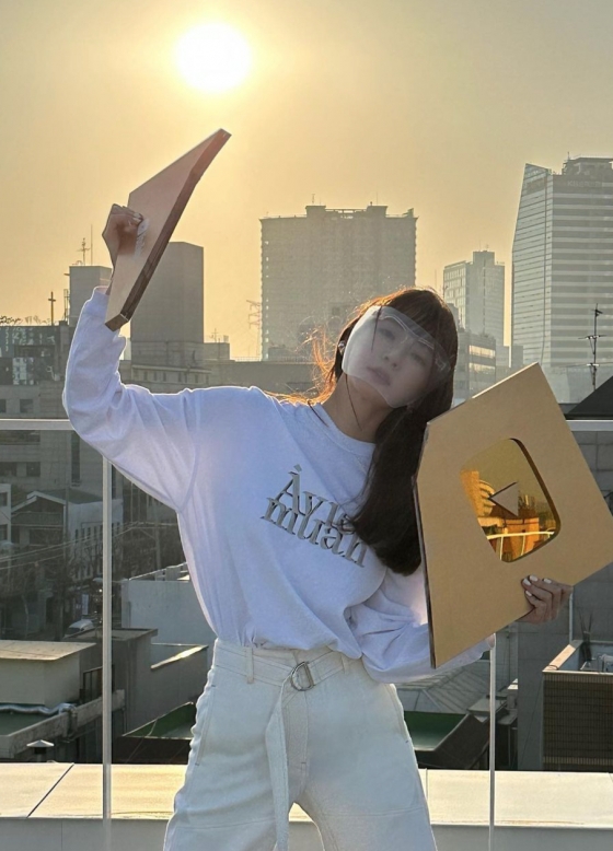 사진에서 강민경은 옥상에서 전기톱을 동원해 자신의 유튜브 채널 골드버튼을 깔끔하게 반으로 갈랐다.