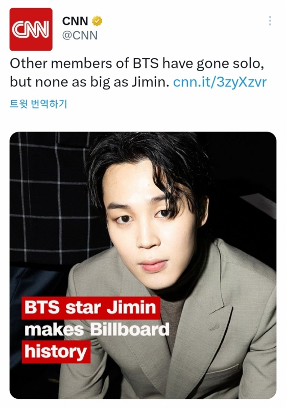 [문완식 스타뉴스 기자] 방탄소년단(BTS) 지민의 한국 솔로 가수 최초 빌보드 '핫 100' 1위 대기록이 글로벌 매체의 집중 조명을 받았다.