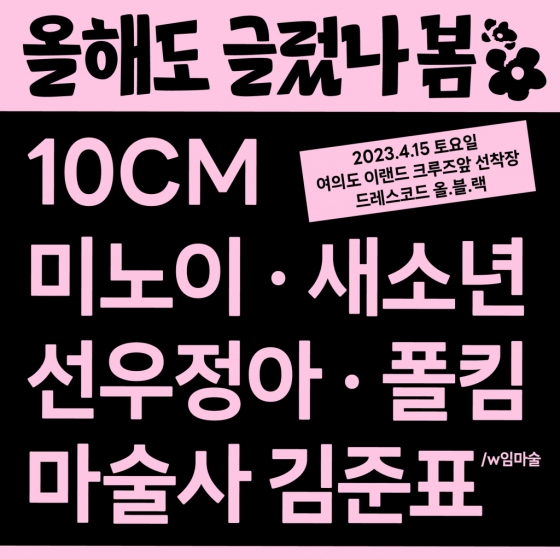 이번 행사의 주최 및 주관사 매직스트로베리 사운드는 10일 10CM 공식 SNS에 '올해도 글렀나봄'의 2023년 라인업 이미지를 공개했다. 오는 15일 오후 1시 30분 서울 여의도의 이랜드 크루즈 선착장 앞에서 무료 버스킹을 진행한다는 소식까지 밝혀 팬들의 뜨거운 관심이 집중됐다.