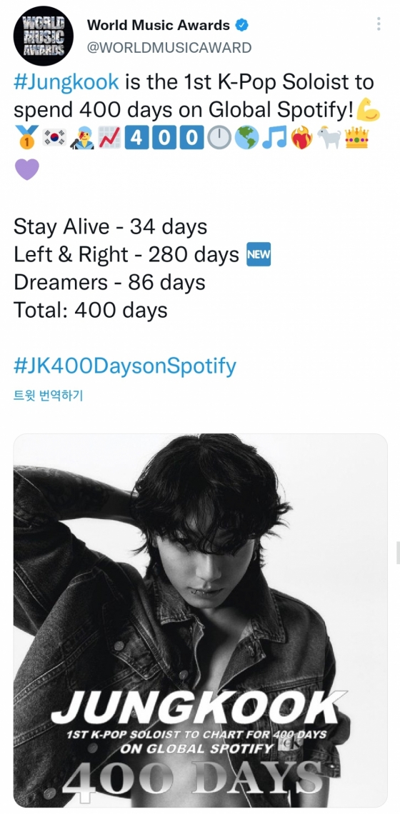 월드뮤직어워드(WMA)에 따르면, 정국은 자신의 스포티파이 계정에 올라있는 솔로곡이자 웹툰OST 'Stay Alive'(스테이 얼라이브)로 34일, 협업곡 'Left and Right'(레프트 앤드 라이트)로 280일, '2022년 카타르 월드컵' 공식 사운드트랙 'Dreamers'(드리머스)로 86일간 글로벌 차트에 차트인하며 도합 400일 진입하는 막강한 저력을 자랑했다.
