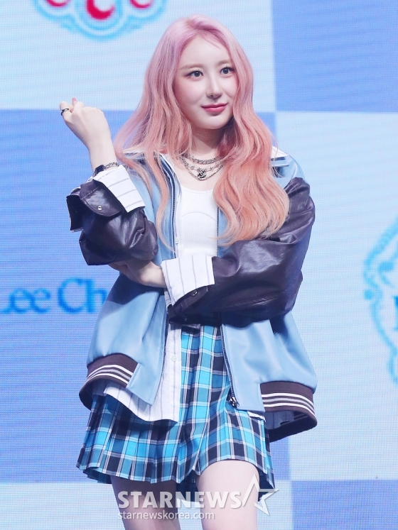 가수 이채연이 12일 오후 서울 광진구 예스24 라이브 홀에서 진행된 미니 2집 'Over The Moon' 발매 기념 쇼케이스에 참석해 포즈를 취하고 있다.