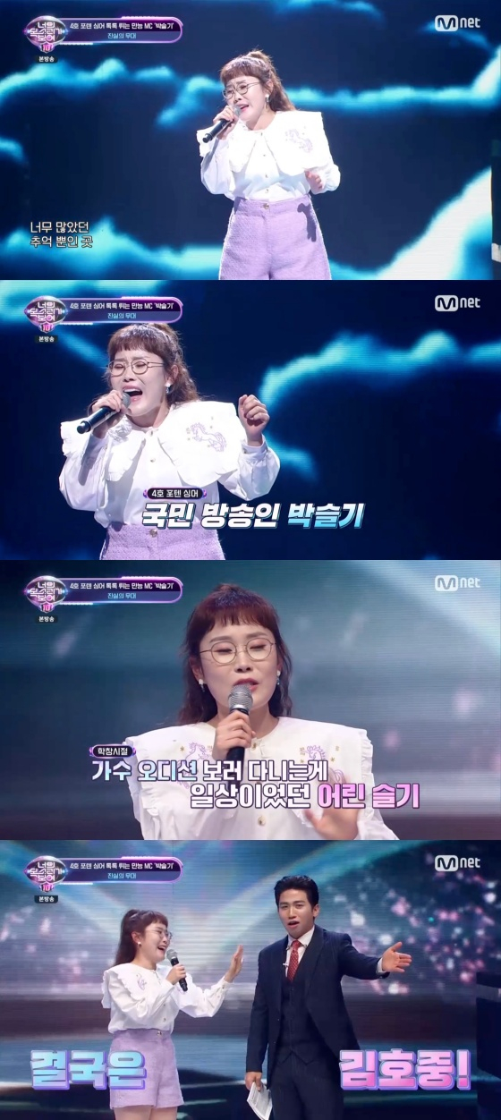 이날 방송인 박슬기가 미스터리 싱어 4호로 출연했다. 박슬기는 "방송인 박슬기입니다"라며 자신을 소개했다. MC 유세윤은 박슬기에 "진짜 노래 실력을 알 수가 없었는데 이렇게 잘하는 줄 몰랐다"라며 감탄했다. 박슬기는 "원래 가수가 꿈이었다. 학창 시절에는 오디션 보러 다니는 게 일상이었다. 제 노래를 보여드릴 기회가 많이 없다. 제가 버선발로 나오게 됐다"고 말했다.