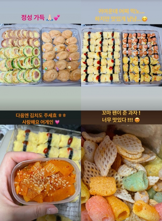 송가인은 14일 자신의 인스타그램 스토리를 통해 "정성 가득. 귀여운데 어찌 먹노..하지만 맛있게 냠냠 다음엔 김치도 주세요. 사랑해요 어게인"이라는 글을 게재했다.
