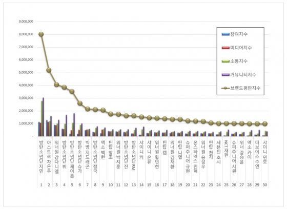 4위, 방탄소년단 뷔 브랜드는 참여지수 589,003 미디어지수 565,010 소통지수 1,001,918 커뮤니티지수 1,694,276이 되면서 브랜드평판지수 3,850,206으로 분석됐다. 지난 3월 브랜드평판지수 4,875,543과 비교해보면 21.03% 하락했다.