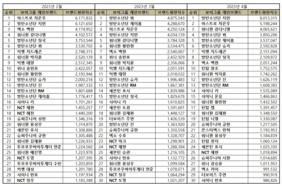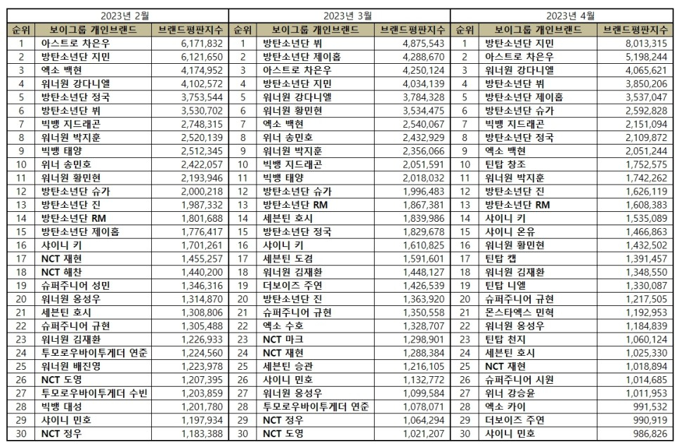 2023년 4월 보이그룹 개인 브랜드평판 30위 순위는 방탄소년단 지민, 아스트로 차은우, 워너원 강다니엘, 방탄소년단 뷔, 방탄소년단 제이홉, 방탄소년단 슈가, 빅뱅 지드래곤, 방탄소년단 정국, 엑소 백현, 틴탑 창조, 워너원 박지훈, 방탄소년단 진, 방탄소년단 RM, 샤이니 키, 샤이니 온유, 워너원 황민현, 틴탑 캡, 워너원 김재환, 틴탑 니엘, 슈퍼주니어 규현, 몬스타엑스 민혁, 워너원 옹성우, 틴탑 천지, 세븐틴 호시, NCT 재현, 슈퍼주니어 시원, 위너 강승윤, 엑소 카이, 더보이즈 주연, 샤이니 민호 순으로 분석됐다.