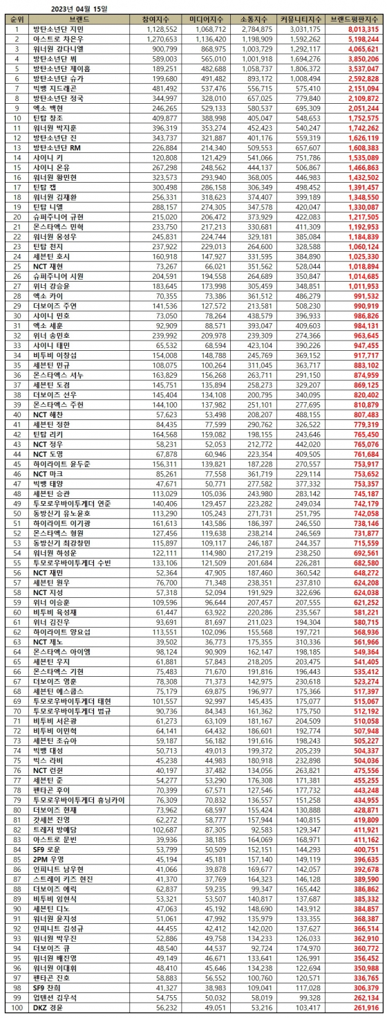 2023년 4월 보이그룹 개인 브랜드평판 100위 브랜드는 방탄소년단 지민, 아스트로 차은우, 워너원 강다니엘, 방탄소년단 뷔, 방탄소년단 제이홉, 방탄소년단 슈가, 빅뱅 지드래곤, 방탄소년단 정국, 엑소 백현, 틴탑 창조, 워너원 박지훈, 방탄소년단 진, 방탄소년단 RM, 샤이니 키, 샤이니 온유, 워너원 황민현, 틴탑 캡, 워너원 김재환, 틴탑 니엘, 슈퍼주니어 규현, 몬스타엑스 민혁, 워너원 옹성우, 틴탑 천지, 세븐틴 호시, NCT 재현, 슈퍼주니어 시원, 위너 강승윤, 엑소 카이, 더보이즈 주연, 샤이니 민호, 엑소 세훈, 위너 송민호, 샤이니 태민, 비투비 이창섭, 세븐틴 민규, 몬스타엑스 셔누, 세븐틴 도겸, 더보이즈 선우, 몬스타엑스 주헌, NCT 해찬, 세븐틴 정한, 틴탑 리키, NCT 정우, NCT 도영, 하이라이트 윤두준, NCT 마크, 빅뱅 태양, 세븐틴 승관, 투모로우바이투게더 연준, 동방신기 유노윤호, 하이라이트 이기광, 몬스타엑스 형원, 동방신기 최강창민, 워너원 하성운, 투모로우바이투게더 수빈, NCT 재민, 세븐틴 원우, NCT 지성, 위너 이승훈, 비투비 육성재, 위너 김진우, 하이라이트 양요섭, NCT 제노, 몬스타엑스 아이엠, 세븐틴 우지, 몬스타엑스 기현, 더보이즈 영훈, 세븐틴 에스쿱스, 투모로우바이투게더 태현, 투모로우바이투게더 범규, 비투비 서은광, 비투비 이민혁, 세븐틴 조슈아, 빅뱅 대성, 빅스 라비, NCT 런쥔, 세븐틴 준, 펜타곤 후이, 투모로우바이투게더 휴닝카이, 더보이즈 현재, 갓세븐 진영, 트레저 방예담, 아스트로 문빈, SF9 로운, 2PM 우영, 인피니트 남우현, 스트레이 키즈 현진, 더보이즈 에릭, 비투비 임현식, 세븐틴 디노, 워너원 윤지성, 인피니트 김성규, 워너원 박우진, 더보이즈 큐, 워너원 배진영, 워너원 이대휘, 펜타곤 진호, SF9 찬희, 업텐션 김우석, DKZ 경윤 이다.