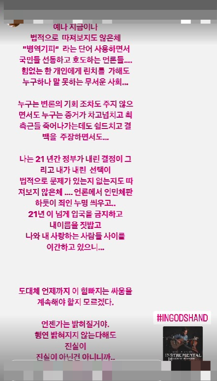 한편 유승준은 재판 직전 장문의 심경 글을 통해 "예나 지금이나 법적으로 따져보지도 않은 채 '병역기피'라는 단어를 사용하면서 국민을 선동하고 호도하는 언론들. 힘없는 한 개인에게 린치를 가해도 누구 하나 말 못하는 무서운 사회"라고 운을 떼고 "누구는 변론의 기회조차도 주지 않으면서도 누구는 증거가 차고넘치고 최측근들 죽어나가는데도 결백을 주장하면서도..."라며 "나는 21년간 정부가 내린 결정이 그리고 내가 내린 선택이 법적으로 문제가 있는지 없는지도 따져보지 않은 채..언론에서 인민재판하듯 죄인 누명 씌우고..21년이 넘게 입국을 금지하고 내 이름을 짓밟고 나와 내 사랑하는 사람들 사이를 이간하고 있으니..."라고 밝혔다. 유승준은 "도대체 언제까지 이 힘빠지는 싸움을 계속해야 할지 모르겠다"라며 "언젠가는 밝혀질거야. 행여나 밝혀지지 않는다 해도 진실이 진실이 아닌 건 아니니까. 끝까지는 가봐야지"라고 덧붙였다.