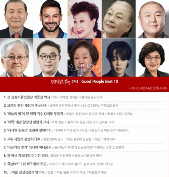 제33회 '굿피플 베스트10'에는 지민과 함께 '의사 10계명'을 정리한 전 삼성서울병원장 이종철 박사, 브라질 빈민가 출신 대구FC 주장 세징야 축구선수, 원조 디바 고 현미와 '한국 신무용의 대모' 고 김백봉, 학폭 예방 앞장선 임민식 교사, '지식인 수호신' 고 조광현 의사, 강철 200배 강도 그래핀 상용화 성공한 그래핀스퀘어 홍병희 대표, KBS 이산가족 찾기 방송 60주년 주목받는 그때 그 진행자 이지연 아나운서, 첫 여성 기동대장 된 서울경찰청 경비대 이수진 경정, 고미술 감정전문가 고미술협회 양의숙 회장 등이 선정됐다.