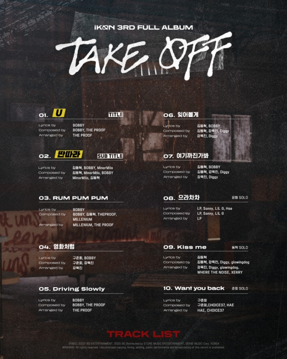 아이콘은 지난 24일 오후 아이콘 공식 SNS 등을 통해 정규 3집 '테이크 오프'(TAKE OFF) 트랙리스트를 공개했다.