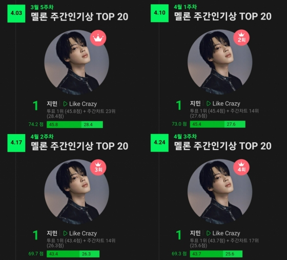 지민은 국내 뮤직 플랫폼 멜론(Melon)의 주간인기상에서 솔로 앨범 '페이스'(FACE) 타이틀곡 '라이크 크레이지'(Like Crazy)로 4주 연속 1위에 올라 '명예 졸업' 타이틀을 획득했다.