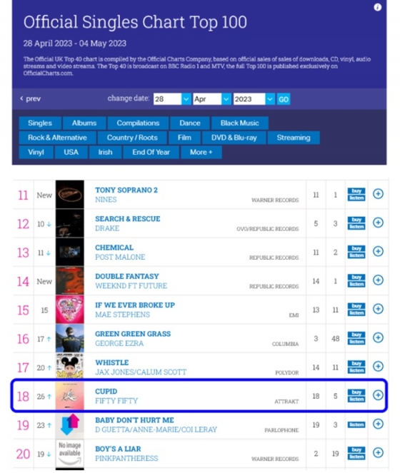 29일(현지 시각) 발표된 영국 오피셜 싱글차트 톱100에 따르면 피프티 피프티 히트곡 'Cupid'가 18위에 올랐다.