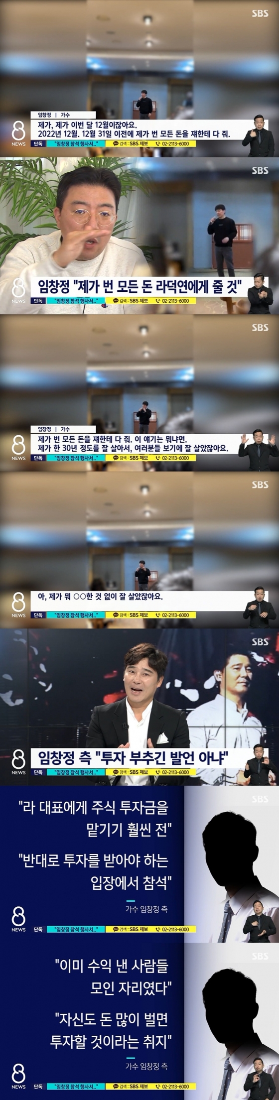 SBS 8 뉴스는 임창정이 마이크를 잡고 "제가, 제가 이번 달 12월이잖아요. 2022년 12월. 12월 31일 이 전에 제가 번 모든 돈을 쟤한테 다 줘"라며 자신이 번 돈 전부를 누군가에게 주겠다고 말하는 동영상을 보도했다. 임창정이 돈을 주겠다고 지칭한 대상 '쟤'는 주가 조작 의혹 사건의 핵심 인물로 지목된 라덕연 투자자문사 대표다.
