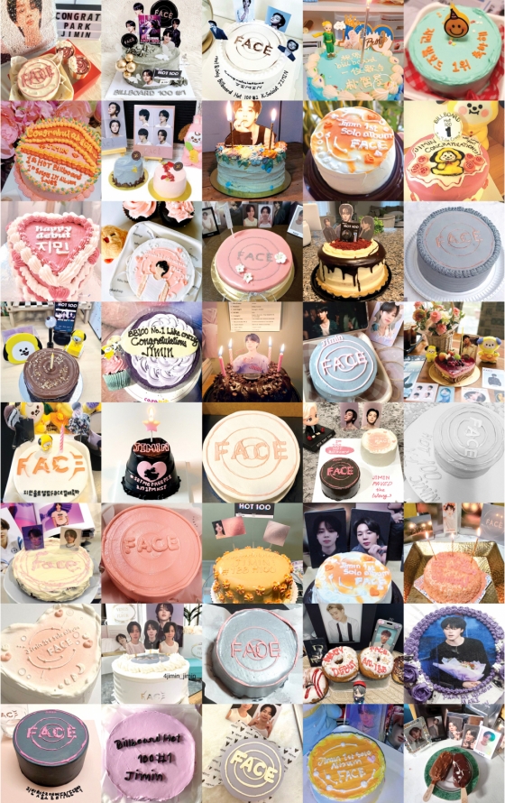지민의 첫 솔로 앨범 '페이스'(FACE) 발매 기념 및 타이틀곡 '라이크 크레이지'(Like Crazy)의 빌보드 메인 싱글 차트 '핫 100' 1위를 축하하기 위한 팬들의 케이크 선물이 소셜미디어에서 줄을 이었다.