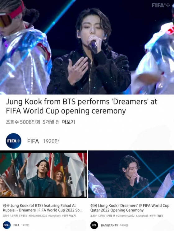 지난해 11월 21일 국제축구연맹 FIFA 공식 유튜브 채널을 통해 공개된 'Jung Kook from BTS performs 'Dreamers' at FIFA World Cup opening ceremony' 영상은 최근 조회수 5000만 뷰를 넘어섰다.