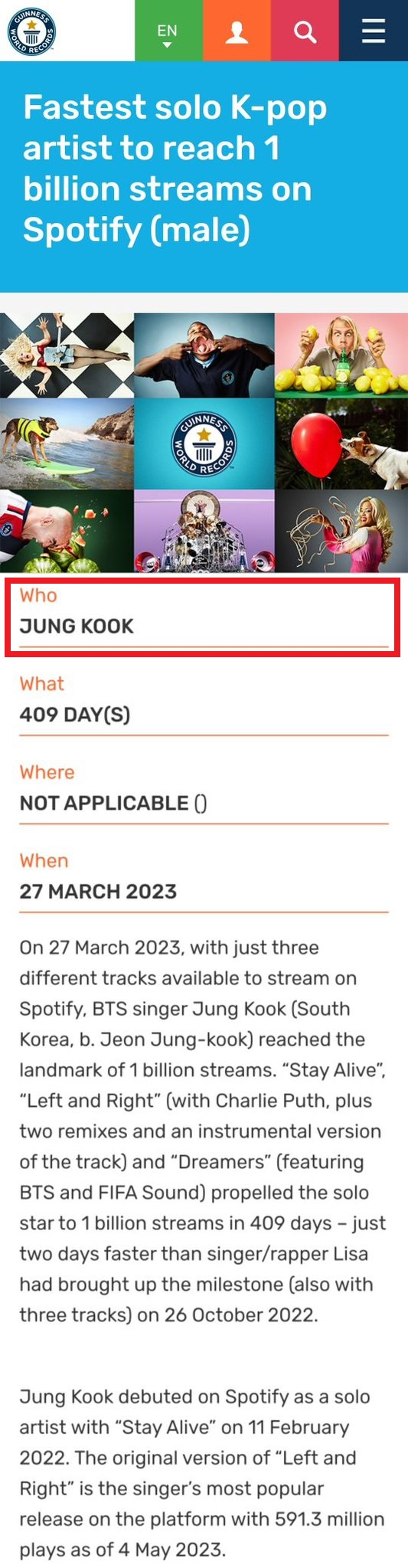 기네스는 정국이 웹툰 '세븐 페이츠: 착호'(7FATES: CHAKHO) OST인 'Stay Alive'(스테이 얼라이브), 미국 가수 찰리 푸스와의 협업곡인 'Left and Right'(레프트 앤드 라이트) 및 '2022년 FIFA 카타르 월드컵' 공식 사운드트랙인 'Dreamers'(드리머스)로 스포티파이에서 409일 만에 10억 스트리밍을 이끌었다고 설명했다.