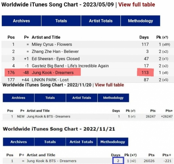정국이 지난해 11월 20일 발매한 '2022년 FIFA(피파) 카타르 월드컵' 공식 사운드트랙 'Dreamers'는 글로벌 음원 플랫폼 '아이튠즈'(iTunes) 5월 9일 자 월드와이드(전세계) 아이튠즈 송 차트에서 176위를 차지했다.