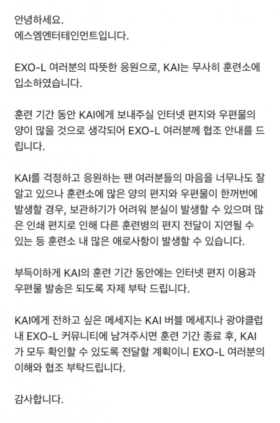SM엔터테인먼트가 카이의 훈련소에 편지와 우편물 발송을 자제해 달라고 부탁했다.