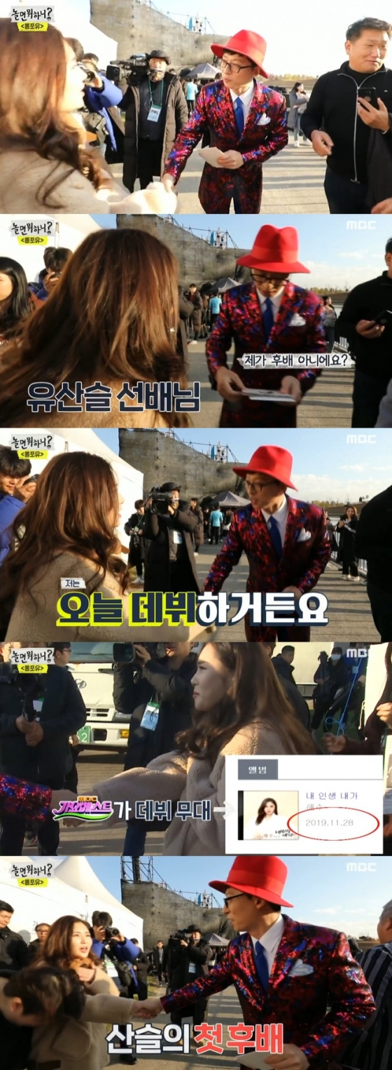 해수(海秀)의 예명은 '바다처럼 깊고 밝다'라는 뜻이라고 알려졌다. 해수가 데뷔한 지난 2019년 11월 28일 MBC '가요베스트' 무대는, 유재석이 MBC '놀면 뭐하니?'에서 부캐 '유산슬'로 처음 섰던 무대이기도 하다. 해수는 이날 '놀면 뭐하니?'에서 리허설을 끝내고 내려오는 유재석에게 CD를 주며 "저는 오늘 데뷔했다"고 말하는 모습으로 방송에 잠깐 등장하기도 했다.