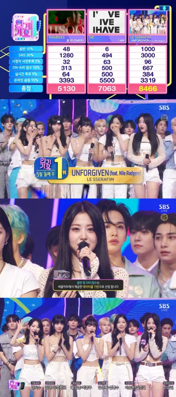 14일 방송된 SBS '인기가요'에서는 지수의 '꽃', 아이브의 'I AM'(아이 엠), 르세라핌의 'UNFORGIVEN'(언포기븐)이 5월 둘째 주 1위 후보에 올랐다.