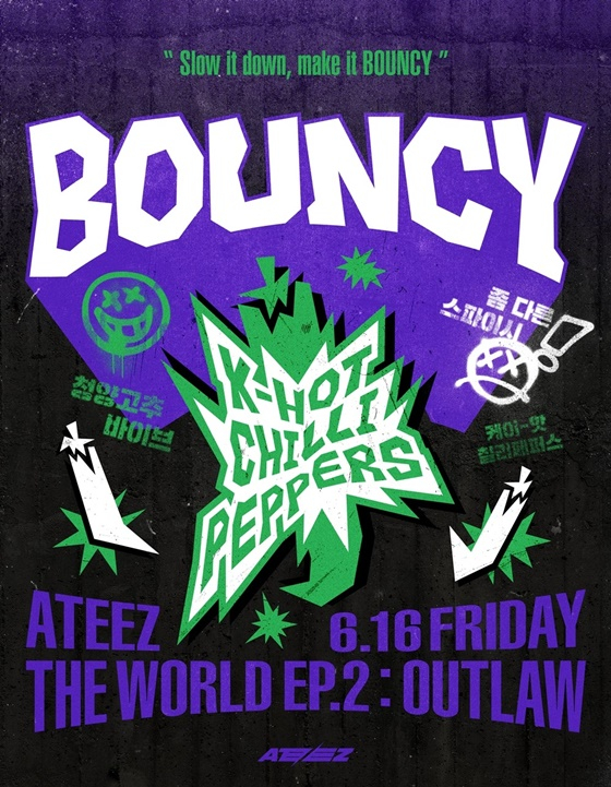 타이틀 포스터에 따르면, 이번 에이티즈의 '더 월드 에피소드 2 : 아웃로우'의 타이틀 곡명은 '바운시(케이-핫 칠리 페퍼스)'(BOUNCY(K-HOT CHILLI PEPPERS))다. 특히 '청양고추 바이브', '좀 다른 스파이시' 등의 문구가 눈길을 끄는 가운데, 가장 위의 'Slow it down, make it BOUNCY'는 앞서 프로모션 맵에도 일부 공개된 문구인 만큼 과연 어떤 의미인지 호기심을 자극한다.